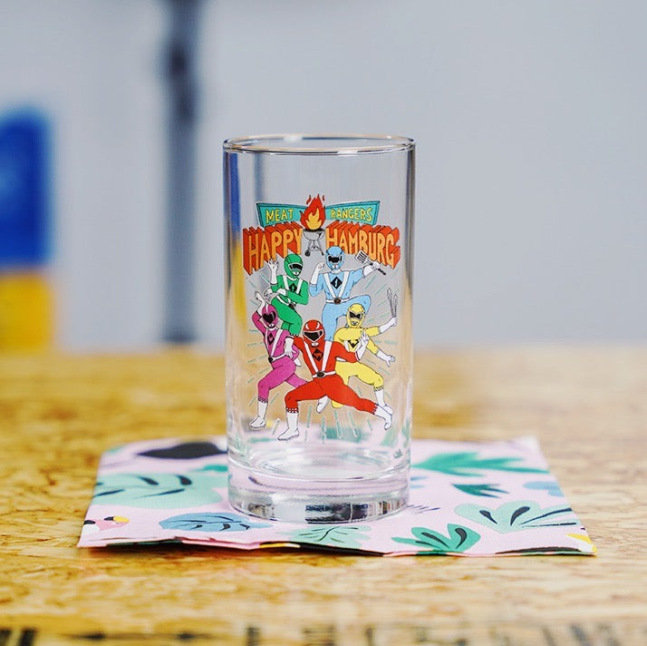 人気の"肉塊戦隊ハッピーハンバーグ"のイラストがプリントされたグラスが出来上がりました。子供の頃の気持ちに戻れるような懐かしいデザインです。